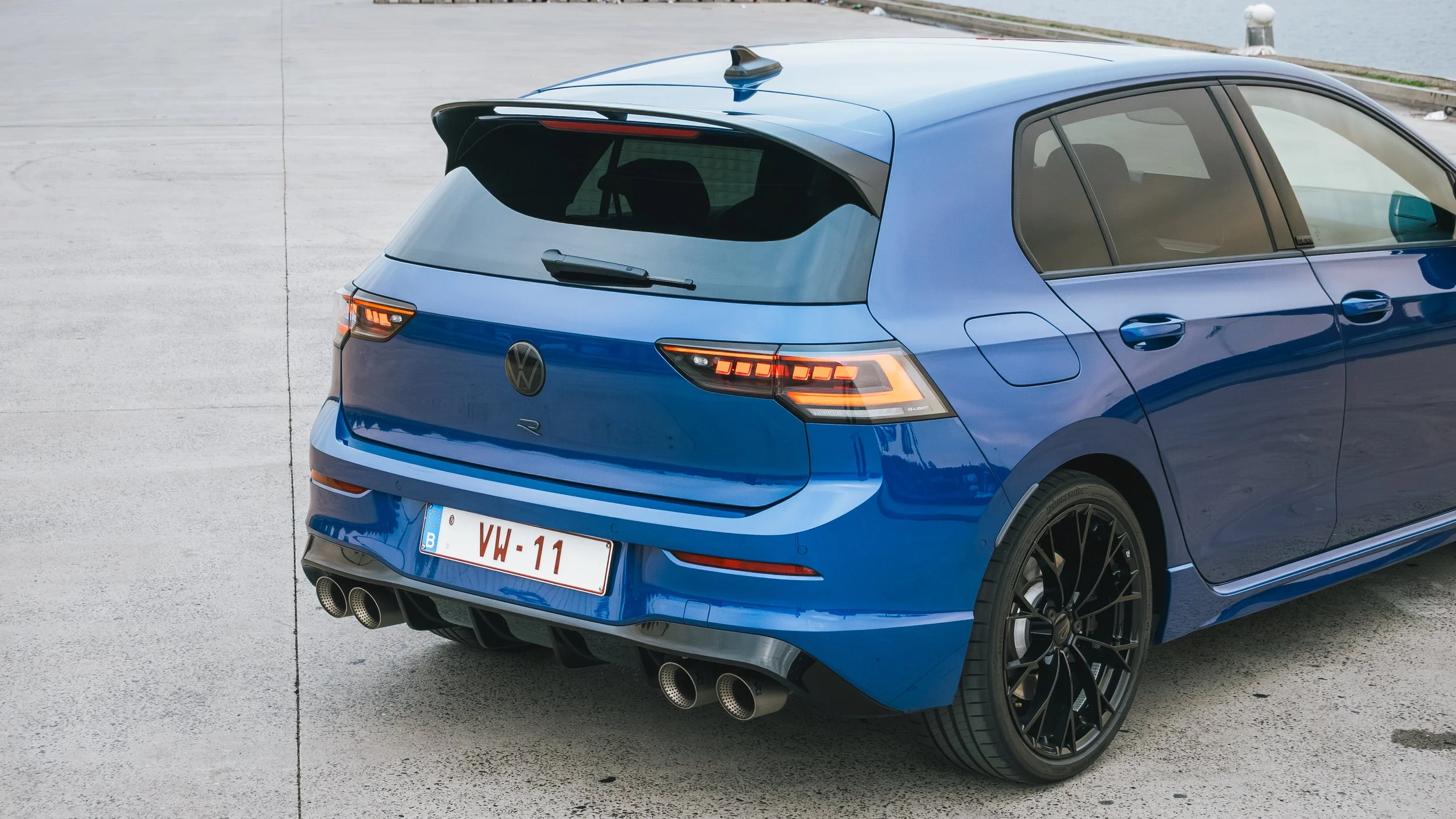La Volkswagen Golf R fait clairement son petit effet, surtout dans cette magnifique teinte Bleu Lapiz. La recette repose sur un mélange parfait entre sportivité et élégance. Les détails noirs et les jantes de 19 pouces, plus légères et pensées pour améliorer le refroidissement des freins, lui donnent ce petit côté plus agressif, plus tendu, qui lui va plutôt bien. Elle ne cherche pas à être discrète, loin de là. C’est une compacte sportive pleinement assumée, avec une identité claire et un look qui annonce la couleur.