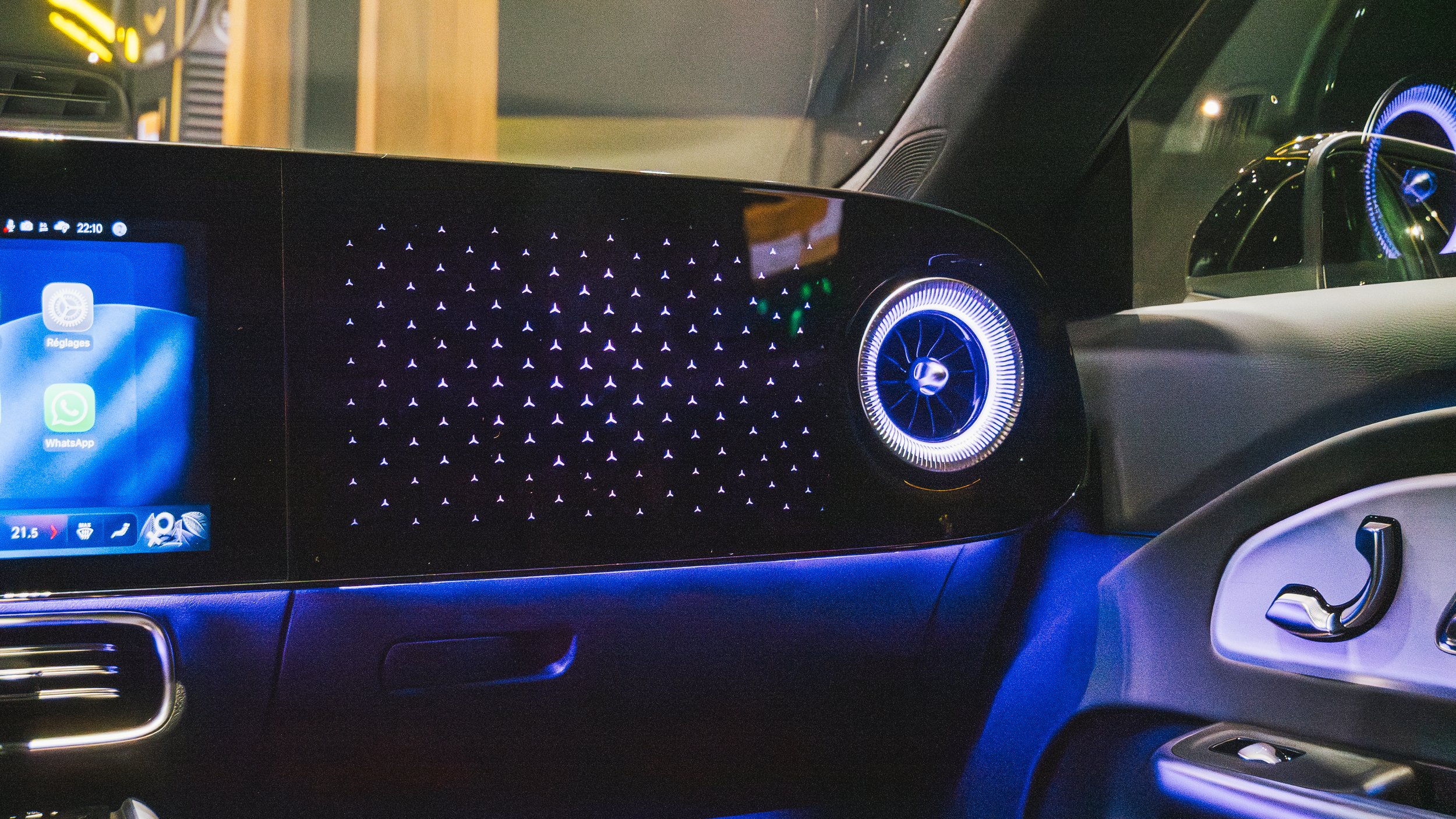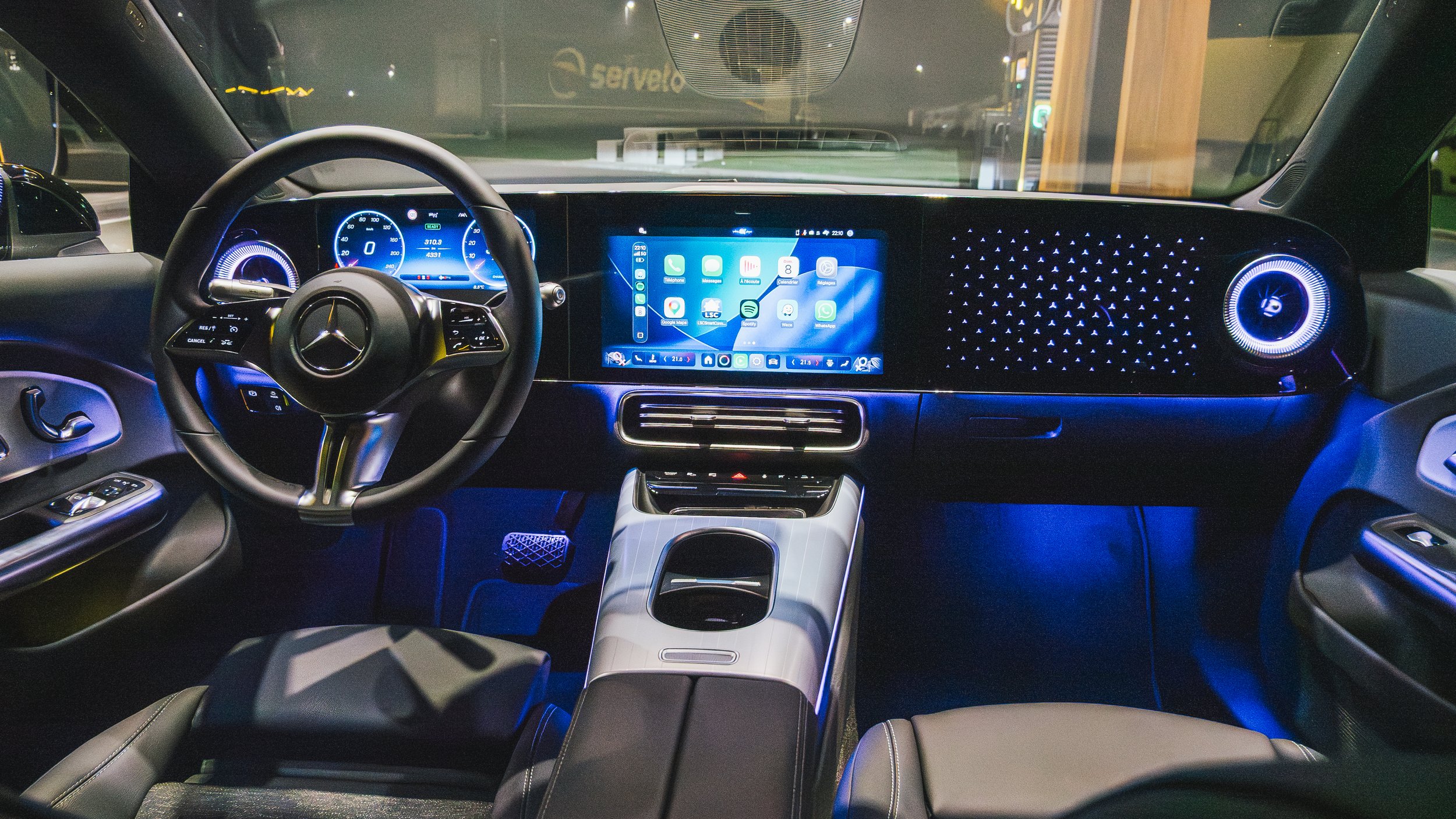 À l’intérieur, on retrouve immédiatement l’univers Mercedes. La qualité est au rendez-vous, avec des matériaux bien finis, y compris dans les parties basses de l’habitacle. Comme souvent chez Mercedes, l’éclairage d’ambiance est particulièrement réussi. De nuit, avec les différentes couleurs personnalisables, ça donne une vraie atmosphère à bord. En revanche tout n’est pas parfait. Le tableau de bord est très épuré, dominé par une grande dalle qui regroupe l’essentiel des fonctions. C’est moderne, oui, mais ça manque peut-être un peu de structure. Surtout, il n’y a quasiment plus de boutons physiques. Tout passe par l’écran. Alors oui, il est fluide, les menus sont clairs, mais à l’usage, ce n’est pas toujours le plus pratique.