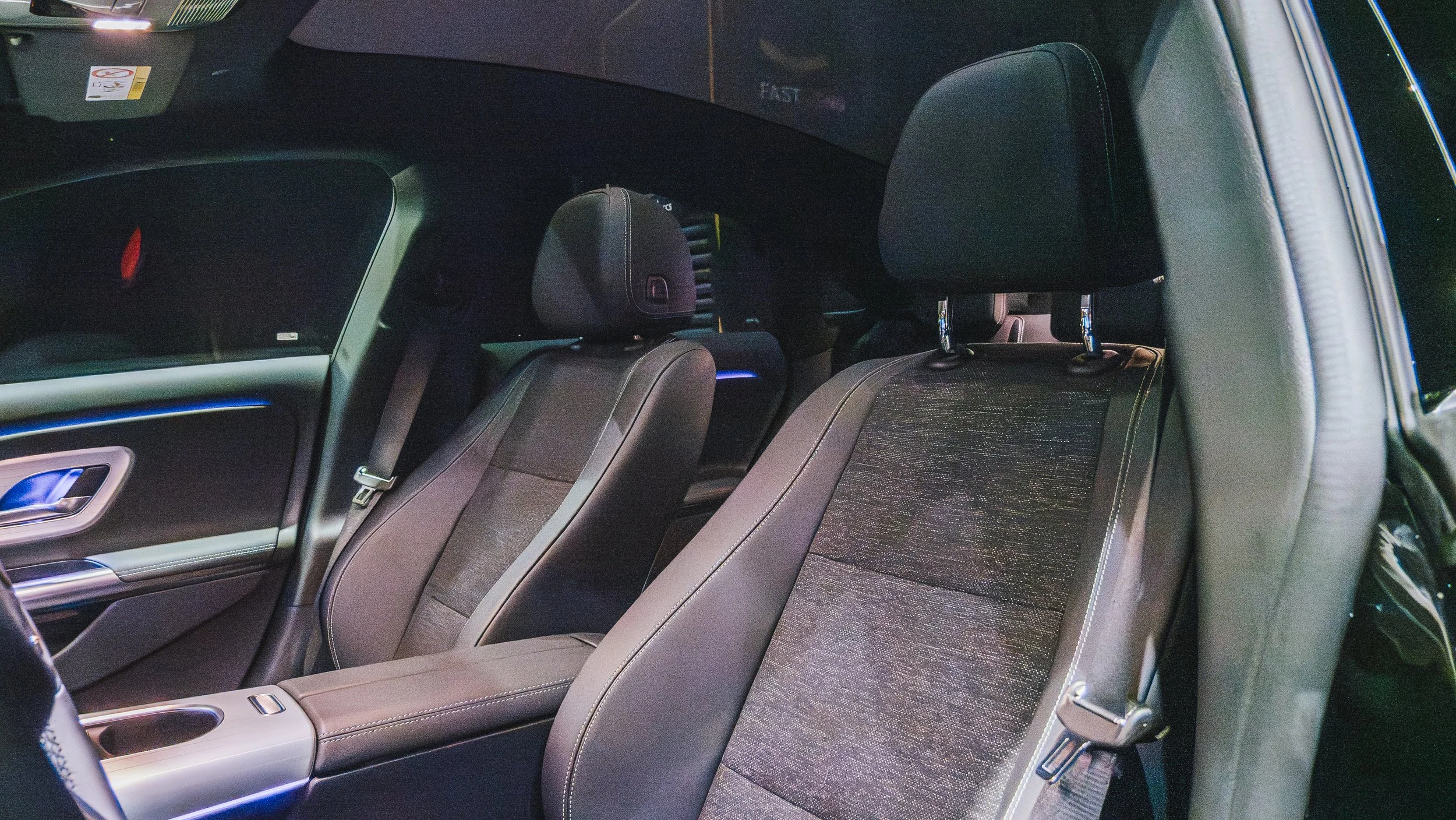 Côté équipements, tout n’est pas parfait. À ce niveau de prix, on aurait aimé une dotation de série un peu plus généreuse. Certaines aides à la conduite, comme le maintien dans la voie, ne sont pas incluses de série. Même chose pour la caméra 360°, qui demande un supplément pour être pleinement exploitée. Et puis il y a aussi ce détail qui peut surprendre : l’intérieur tissu de série sur une voiture à plus de 60 000 €. La qualité est bonne, rien à dire là-dessus, mais le choix reste discutable. Rien de rédhibitoire, mais on sent clairement que Mercedes laisse une large place aux options.